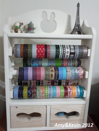 (我說胖子,紙膠帶架子該不會就是我的生日禮物吧?今天又多了兩個抽屜,要維持木頭原色還是漆成草綠色好呢?ㄎㄎ~~)